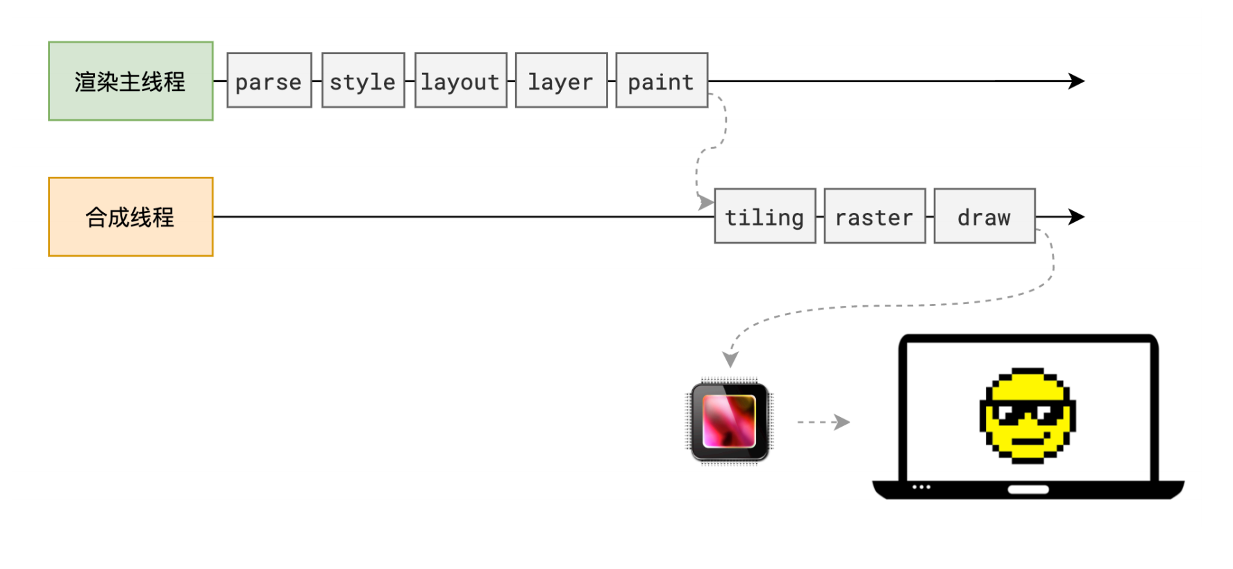 另外,还有一个重要的点你需要知道,生成绘制指令集后,渲染主线程的工程就暂时告一段落,接下来主线程将每个图层的绘制信息提交给合成线程,剩余工作将由合成线程完成。
