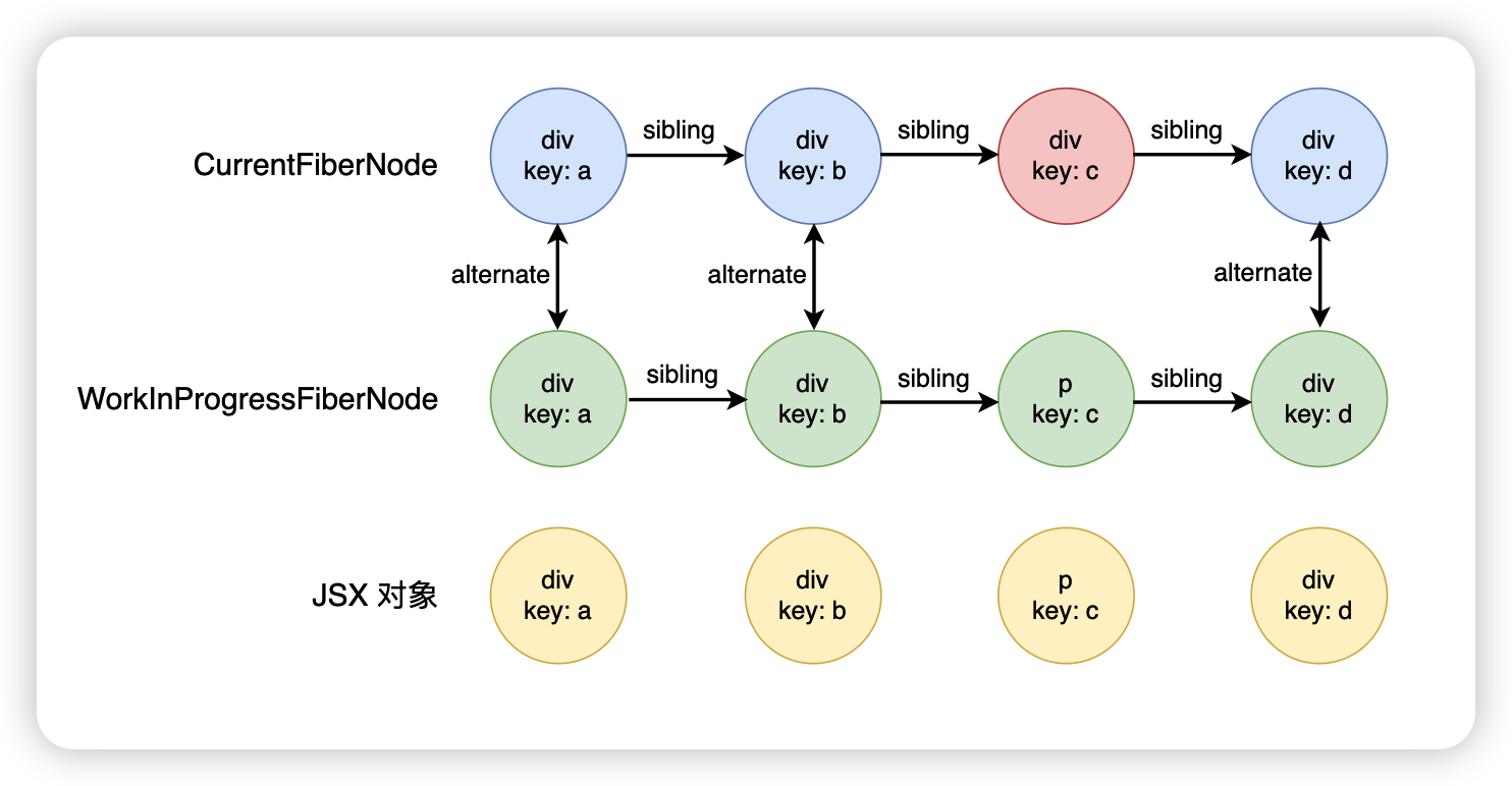 如果上面的例子中,key 不同只能代表当前的 FiberNode 无法复用,因此还需要去遍历兄弟的 FiberNode