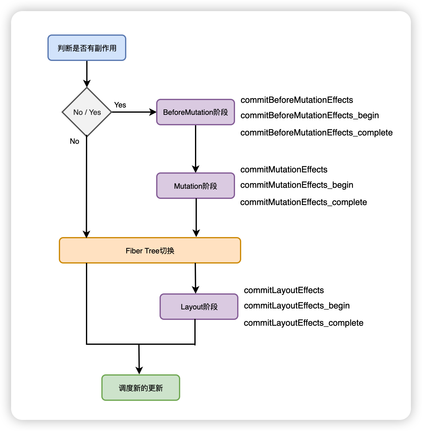 渲染器的工作主要就是将各种副作用(flags 表示)commit 到宿主环境的 UI 中。整个阶段可以分为三个子阶段,分别是 BeforeMutation 阶段、Mutation 阶段和 Layout 阶段。